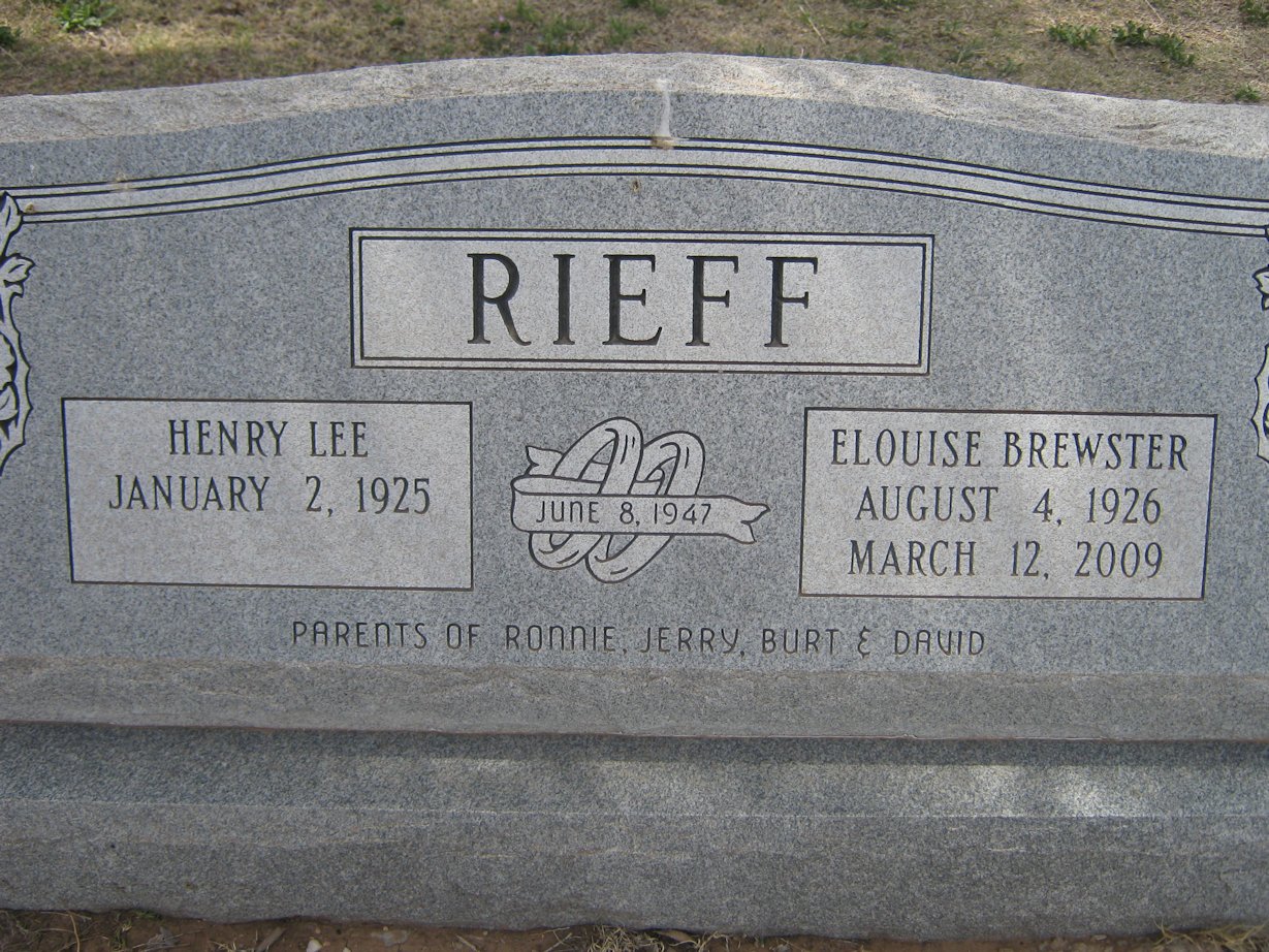 Elouise Brewster Rieff of Cotton Center passed away Thursday, March 12, 2009, in Plainview. Funeral services will be at 10 a.m. Saturday, March 14, 2009, in First Baptist Church of Plainview with Dr. Travis Hart, pastor, officiating and the Rev. Kenneth Coates assisting. Burial will follow in Plainview Cemetery under the direction of Kornerstone Funeral Directors of Plainview. A visitation for family and friends will be from 6-7:30 p.m. today, March 13, 2009, at the funeral home. Mrs. Rieff was born Aug. 4, 1926, in Taylor County, Texas, to Thomas Albert and Eulala Fain Brewster. She married Henry Rieff on June 8, 1947, in Cotton Center, Texas. Mrs. Rieff grew up in Cotton Center and graduated from Cotton Center High School in 1943. She received a bachelor's degree in education and master's degree from Hardin-Simmons in 1946. She taught school at Highland Elementary in Plainview. She also taught kindergarten and first grade in Cotton Center for 18 years. Mrs. Rieff was the director of the Hale County Farm and Ranch Museum from 1986-2007. She was a member of First Baptist Church in Plainview. Elouise is survived by her husband, Henry Rieff of Cotton Center; four sons, Ronnie Rieff and his wife, Thresa, of Lubbock, Jerry Rieff and his wife, Marion, of Hale Center, Burt Rieff and his wife, Lynne, of Florence, Ala., and David Rieff and his wife, Sydney, of Amarillo; two sisters, Joyce Neis of Plainview and Tommye Ruth Stallings of Abernathy; 12 grandchildren; and one great-grandson. The family wishes to thank their special friends at Prairie House Living Center and Area Community Hospice. Memorials may be made to the Hale County Farm & Ranch Museum, P.O. Box 834, Hale Center, TX 79041.
